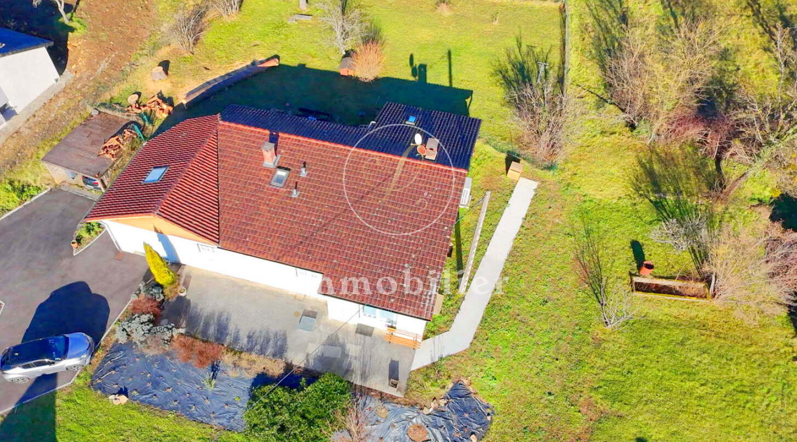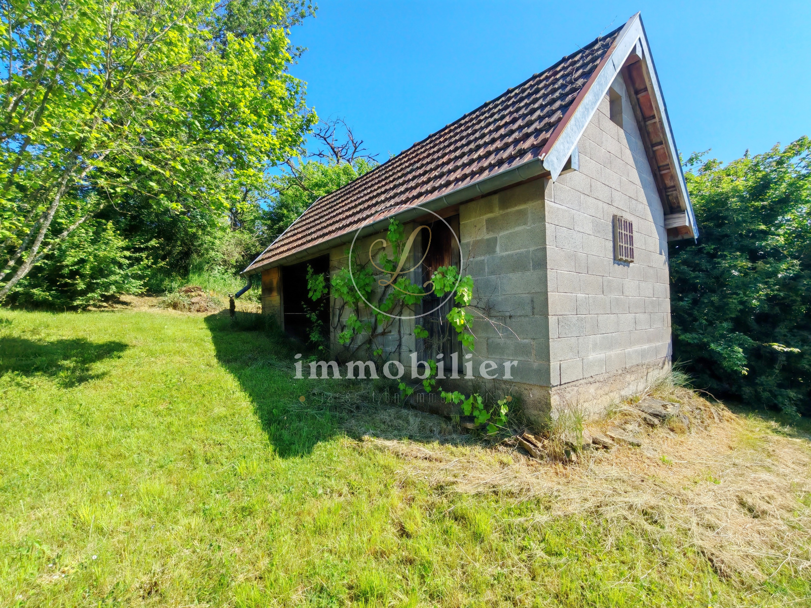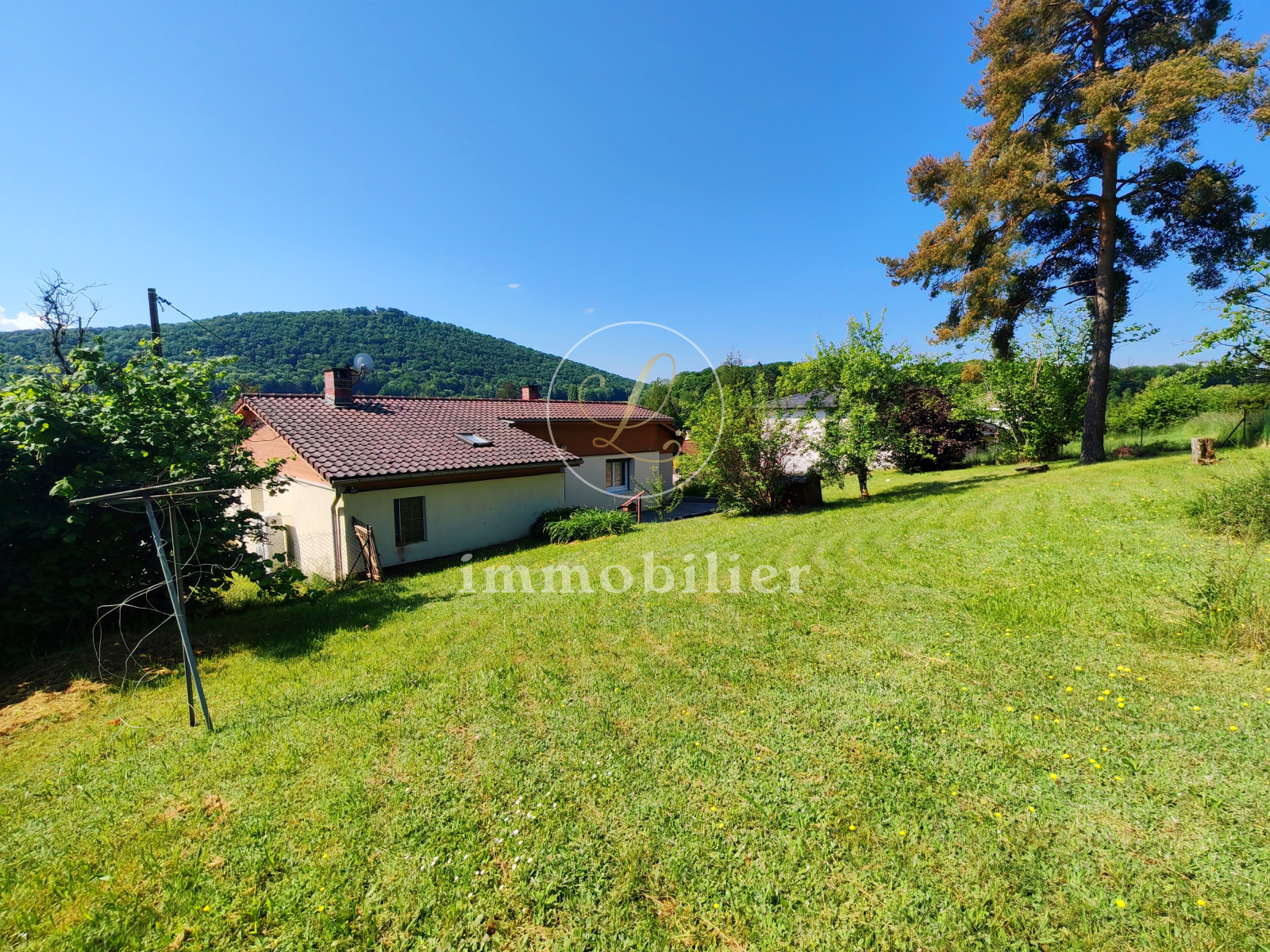 La maison dispose de deux terrasses (Nord et Sud) et le terrain est arboré.